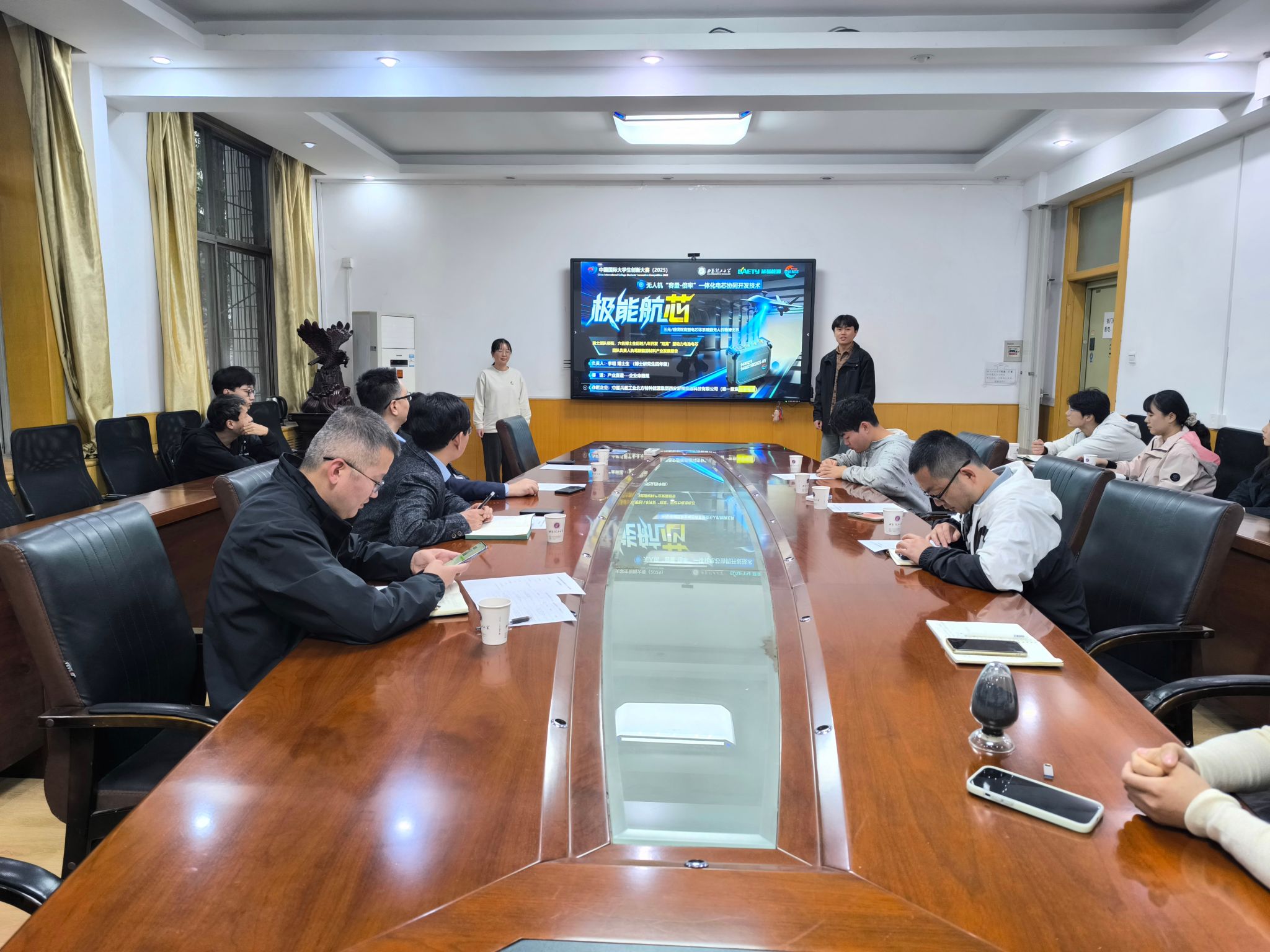 2025年,材料学院共有两个项目入围国赛现场答辩,分别为主赛道项目“层覆锂翼——ALD技术重塑无人机动力电池革新者”和产业赛道项目“极能航芯-三元/硅碳双高型电芯体系赋能无人机驰骋无界”。座谈会上,两个项目团队进行了路演展示,参会领导围绕项目ppt展示、路演表达技巧进行了细致点评。会议最后,李喜飞院长和邹军涛书记分别讲话。李喜飞院长表示学院将全力支持参赛团队备赛工作,保障参赛师生需求,他要求参赛团队要熟悉决赛基本规范要求,比赛过程中通力合作,相互关照,严守赛场纪律,尊重评委和对手,虚心听取评委意见,展现材料学子的良好风采。邹军涛书记向成功晋级国赛现场答辩的项目团队表示热烈祝贺,对团队成员付出的辛勤努力致以衷心感谢,并提出了期望与要求:一是要精益求精,全力备赛。项目团队要秉持精益求精的态度,对各个环节反复斟酌、持续优化,切实提升项目的成熟度与表现力,确保每一处细节都经得起检验。二是要不忘初心,历练成长。参赛团队既要有备赛的“紧张感”,更要有参赛的“松弛感”。要牢记“以赛促学、以赛促创”的参赛初心,充分准备、轻装上阵,从容展示,实现能力素质的多方面提升。