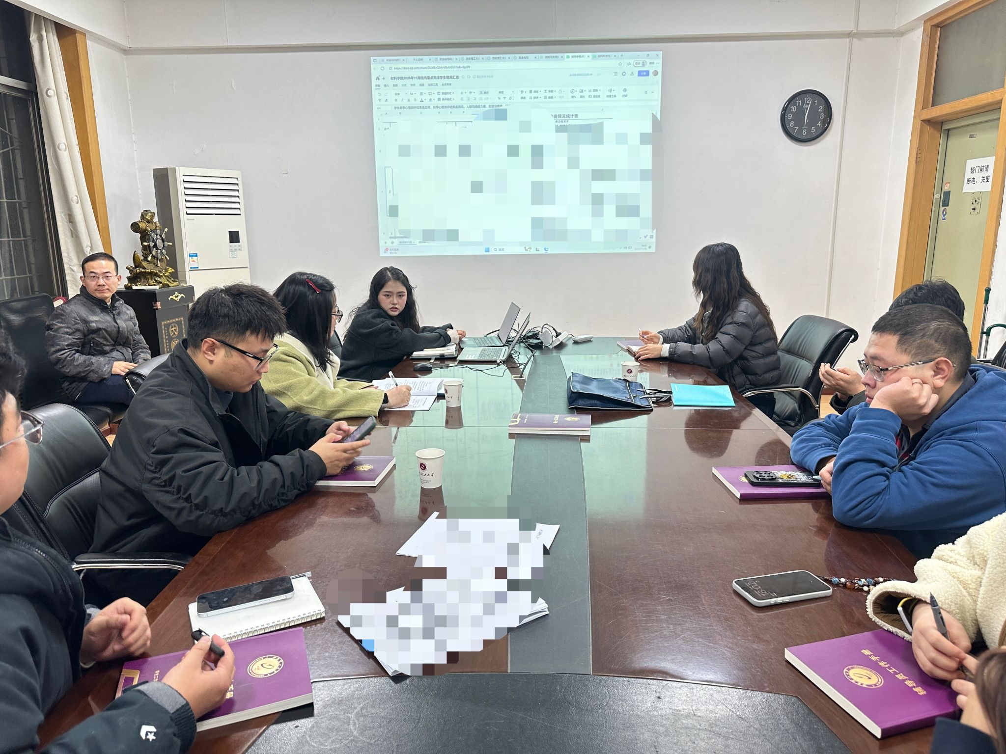 会上,全体辅导员对重点关注学生的情况进行汇报,详细介绍了各自负责学生的近期心理状态、潜在风险点及已采取的干预措施。刘洋针对学生情况,提出了针对性的建议与解决策略,鼓励大家采用更加个性化、精细化的工作方式,确保每位学生都能得到及时、有效的心理支持。会议期间,与会人员还就如何加强校院两级心理健康教育的联动机制进行了讨论,旨在构建一个更加紧密、高效的心理健康支持网络。杨少博总结指出,全体辅导员需持续增强心理健康教育的责任感与紧迫感,严格执行“一生一策”制度,确保学生心理健康工作的系统性、科学性和实效性。