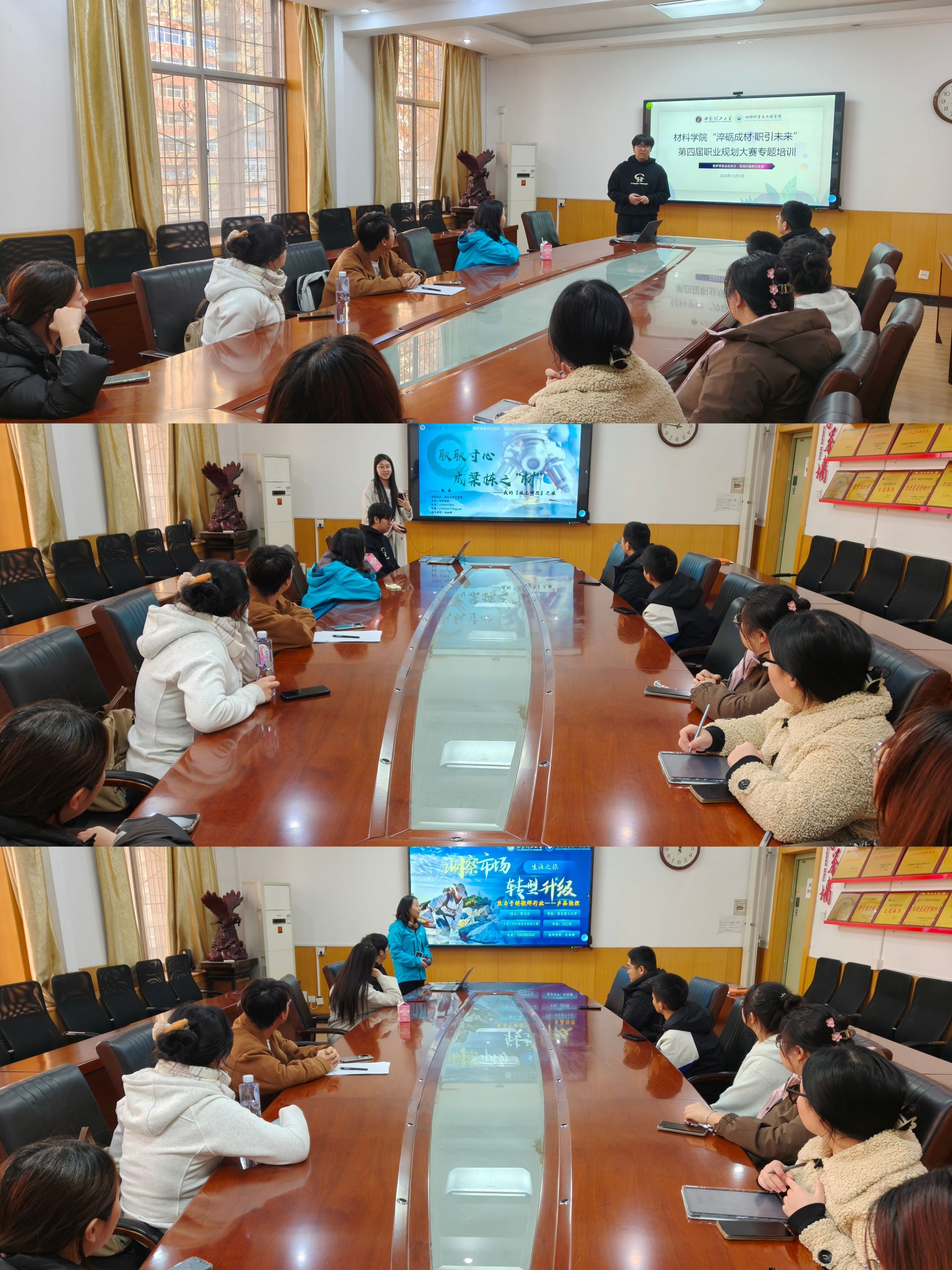 12月5日,材料学院在教二楼金花校区会议室成功举办“淬砺成材·职引未来”第四届职业规划大赛专题培训会。本次活动邀请我校第一届职规赛成长赛道第一名耿晶、第三届成长赛道第一名郭纪江和第三名陈灵玲担任分享嘉宾,面向本院十余名参赛选手进行了精准赛前指导。