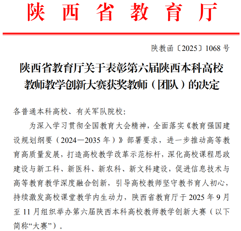 12月4日,陕西省教育厅公布了第六届陕西本科高校教师教学创新大赛获奖教师(团队)表彰名单,材料学院材料系于晓婧教师(团队)获得新工科中级及以下组教学创新大赛一等奖,参赛课程是《金属热处理工艺学》,课程团队成员包括了赵康教授,刘照伟老师,徐雷老师。