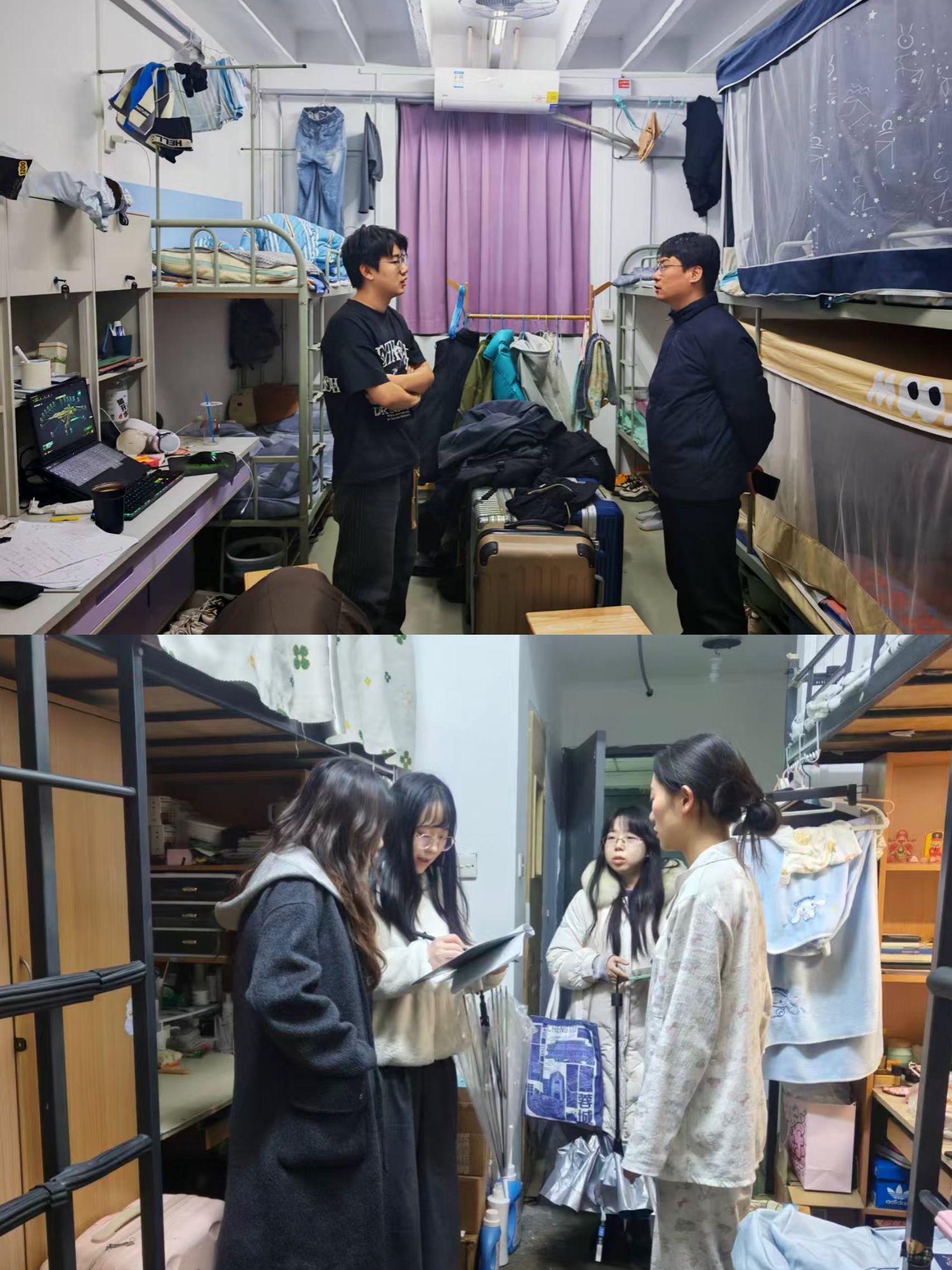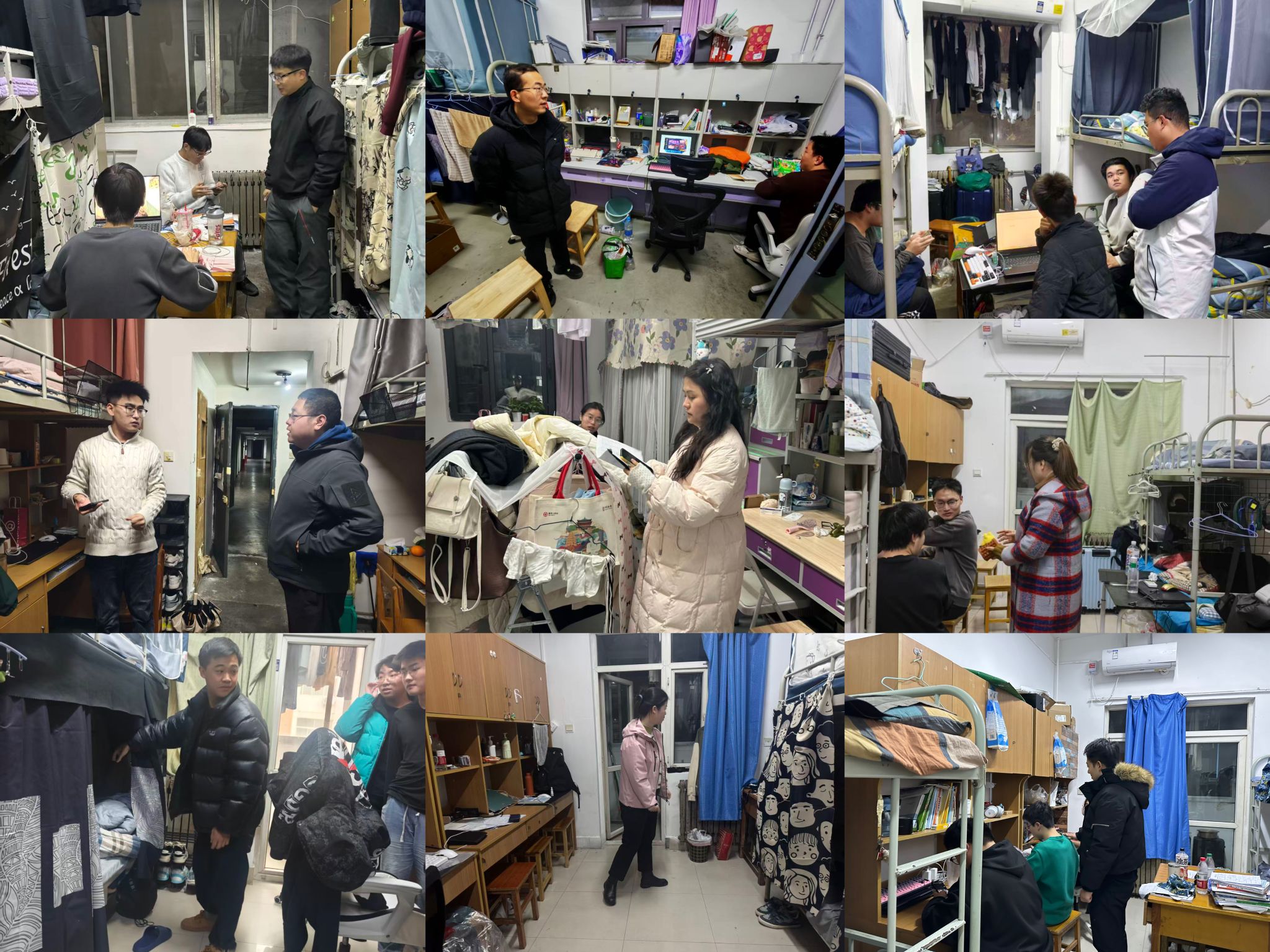 学院通过深入宿舍、开展心理会商、组织八类学生专题研讨、辨识学生等方式扎实推进安全稳定工作。党委副书记兼副院长杨少博带队进行宿舍检查,全体辅导员与学生们进行了细致深入的交流,并强调了宿舍作为“第二课堂”的重要性,鼓励学生们在宿舍内形成互学互助、共同奋斗的良好风气,杜绝沉迷手机游戏、影响他人休息等不良现象,将宿舍打造成学风建设的重要阵地。针对宿舍人际关系、心理调适等问题,辅导员也给予了专业的建议,引导学生学会沟通、懂得包容,共同构建和谐的宿舍人际关系。同时,辅导员提醒外出学生注意交通安全、避开人员密集场所;叮嘱留校学生按时归寝,强化自我安全责任意识。