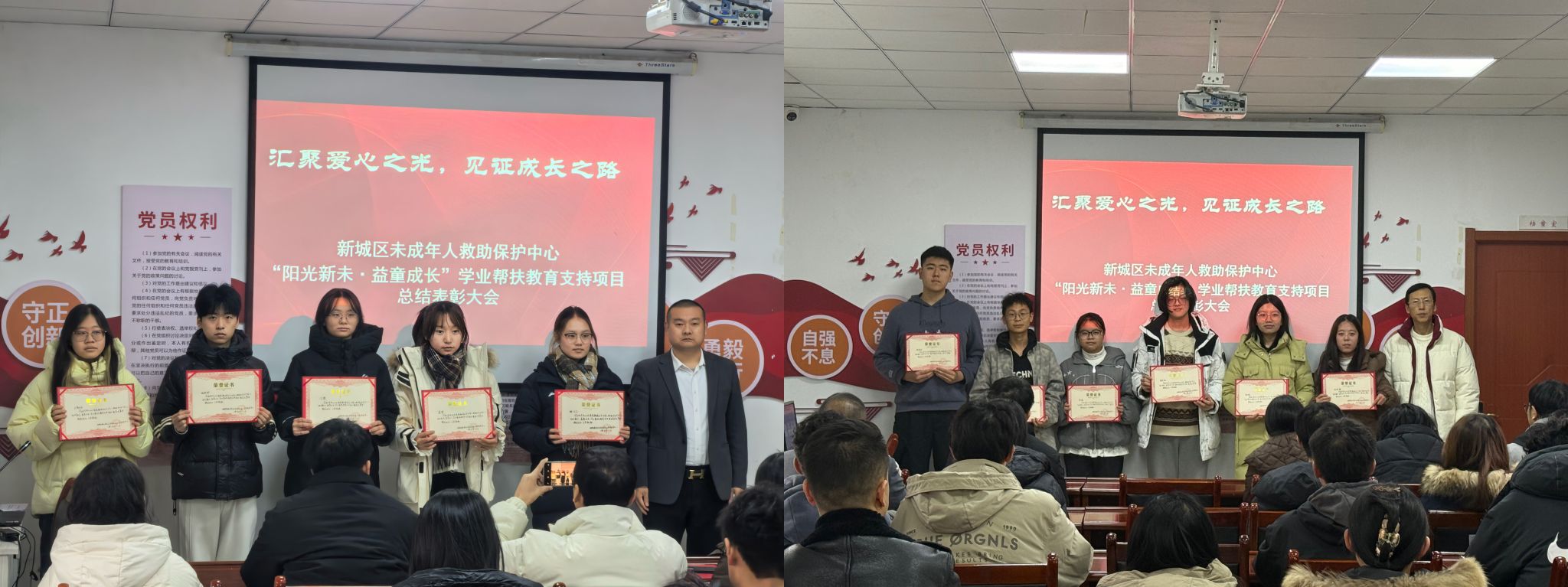 为深化实践育人成效,弘扬志愿服务精神,2026年1月3日下午15:00,新城区未成年人救助保护中心“阳光新未·益童成长”学业帮扶教育支持项目总结表彰大会圆满落幕。西安理工大学材料学院本科生第三党支部书记李子琦及11名材料学子参会。