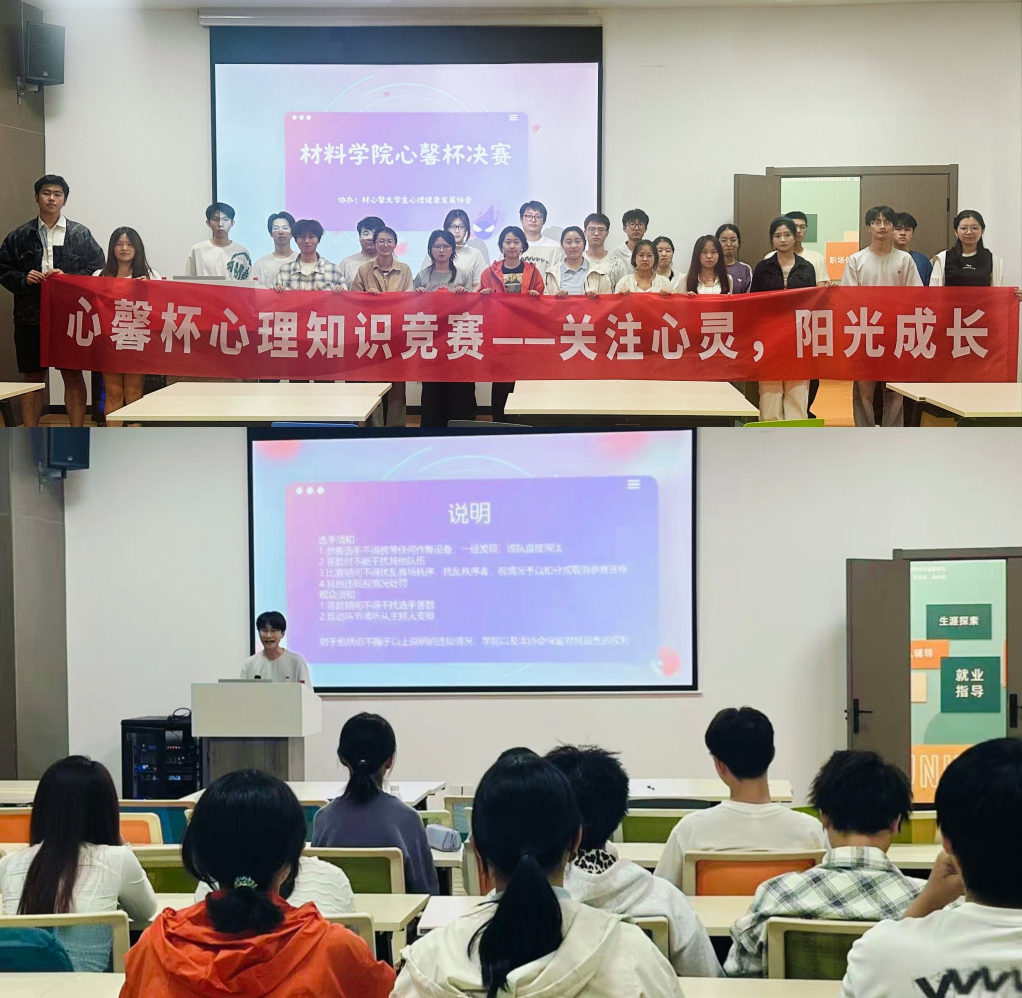 2026年4月17日,材料学院第四届“心馨杯”大学生心理健康科普知识竞赛决赛在曲江校区一站式服务中心圆满落幕。本届竞赛以“以心为舟,馨伴同行”为主题,由学院材心馨驿站主办、材心馨大学生心理健康发展协会承办,吸引全院百余名学生积极参与。