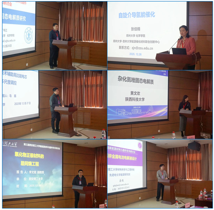 大会报告下半场由西安理工大学材料科学与工程学院院长兼先进电化学能源研究院执行院长李喜飞教授主持,郑州大学张佳楠教授、西北工业大学马越教授、陕西科技大学黄文欢教授、西安理工大学李文斌副教授和秦戬副教授从电催化、储能材料与器件失效机理、电解质设计及新型电池体系等多个方向展开深入交流。